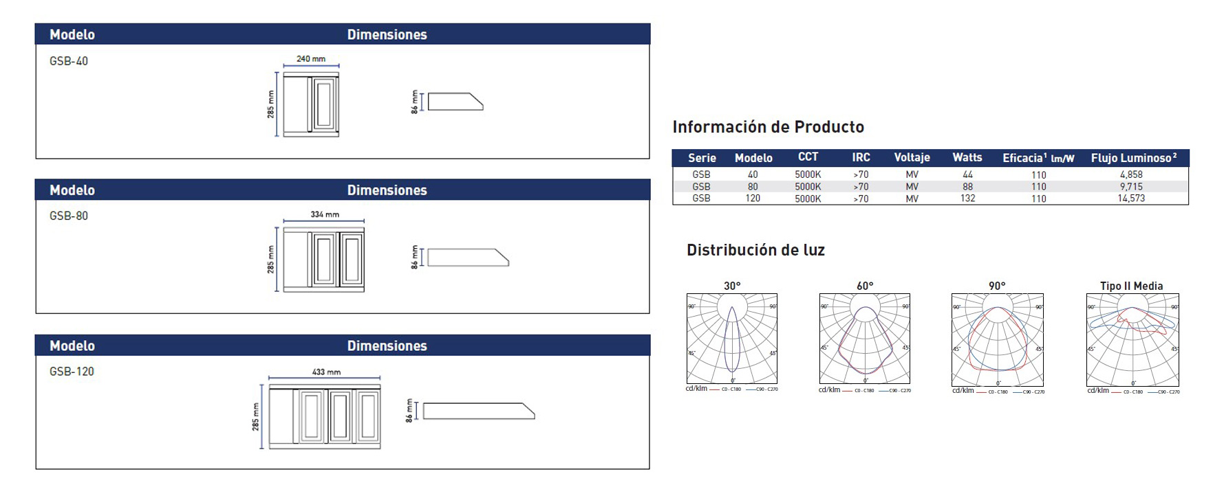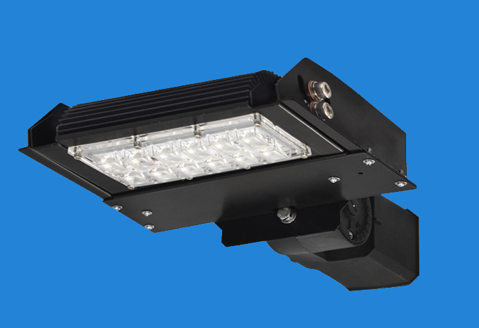 Luminaria para brazo de poste, con módulos LED de 40W. Su brazo integrado permite la rotación de los módulos para dirigir la luz a la dirección deseada.